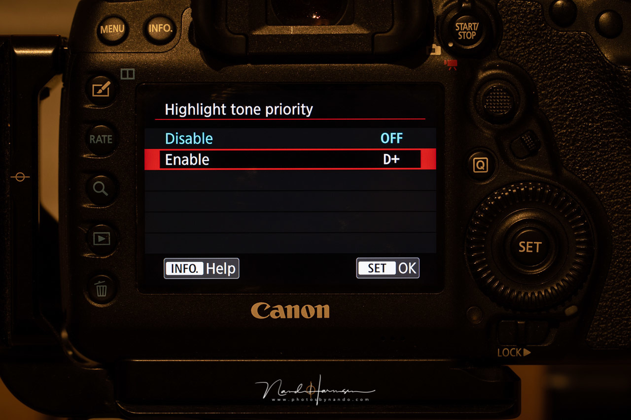 Canon warns what will happen when you turn on the highlight tone priority. The lowest ISO level is raised, and it tells you about the risk of an increase in noise in the darkest parts, of course. This might not come as a surprise, since it uses a higher ISO level, especially when you use the D400 option in Fujifilm, forcing you to use at least ISO 800.