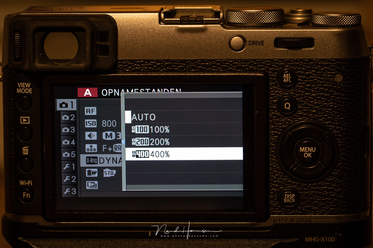 The left side is the D100 setting on the Fujifilm X100T, right side is the D400 setting. Both images are the raw files. I used a manual setting of ISO 800, f/8, and 1/125 for both and decreased the highlights and white point settings in Lightroom.