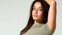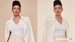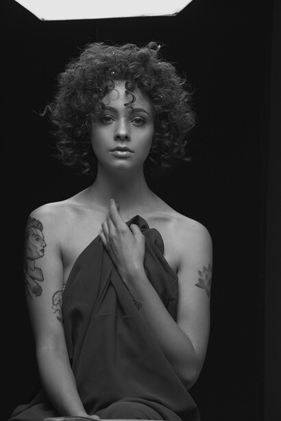 I allowed one light to do most of the heavy lifting. As you can see in the diagram, one large light source, a sixty-inch Westcott Rapid Box, was boomed directly over and slightly in front of the model. This gave me downward light direction that carved out my model's features, but since the center of the large modifier was in front of the model and she was sitting on a stool, the light bounced back up into the shadows and gave me enough fill to keep everything open. The second, smaller light was used as a hair light and added just a bit of rim light to her exposed shoulders, ensuring the model would pop off the dark backdrop.