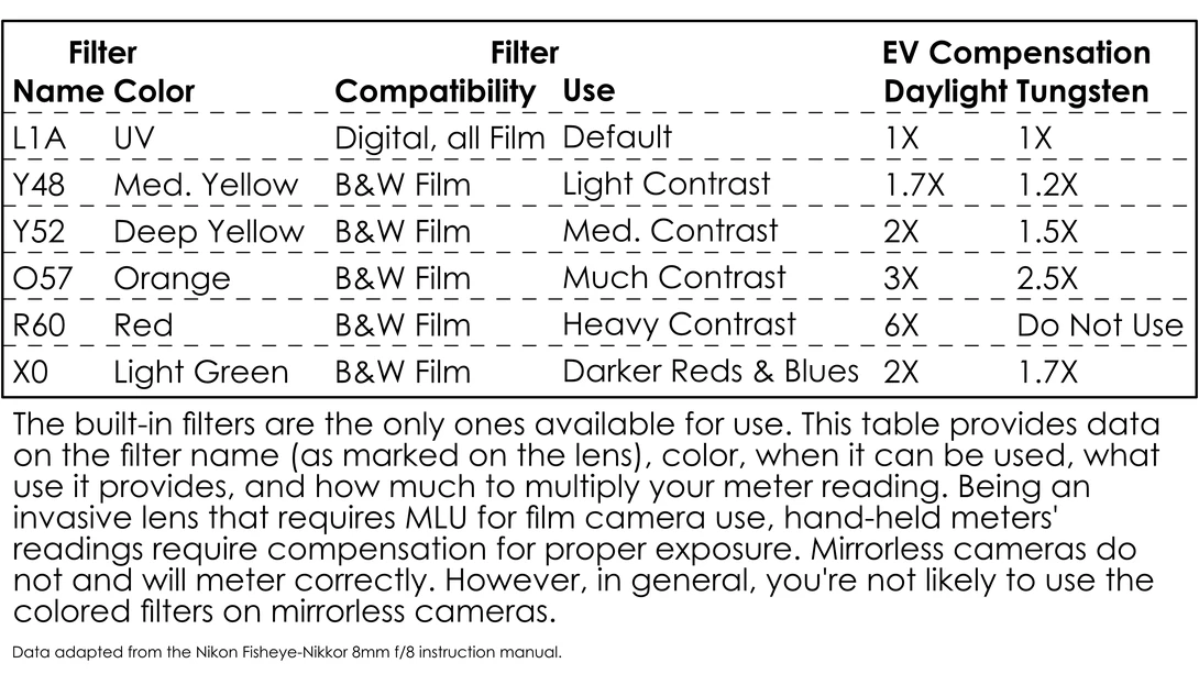 Nikon released the 8mm f/8 Fish-eye Nikkor primarily for use pointed straight at the sky. This allowed photographers to capture clouds and cloud movements, measure the distance of objects from the sky's zenith, and measure the angular distances between two objects in a straight line from the zenith. To help photographers photograph clouds, Nikon included six filters built into the lens as part of the optical path. The video below shows the effects each filter has. Following the video, a table presents the filter information as reproduced from the lens' manual.