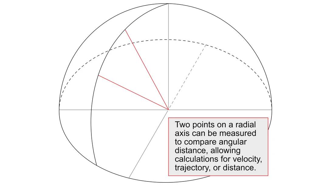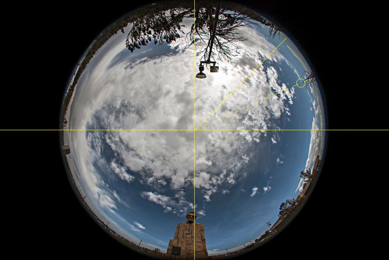 And that's it. That's what this lens does, right? Well, no. There's another trick. Let's go back to that meteor, and assume we're trying to ascertain progress and trajectory. Going back to our original image, let's find two points on that image and calculate the angular difference between them. These will be different solely because there are no other good points to reference in the line from the zenith to the tree tip. This next trick requires that you picture the lens' image as a half-sphere. The measuring point is in the center, halfway to the imaginary nadir, at the half-sphere's flat bottom. The image the lens projects can be thought of as being painted on the upper, round portion of the half-sphere. We'll be measuring the angular difference from the center on the flat bottom to two points on the sphere's surface. The graphic below, adapted from the lens' manual, shows this concept and illustrates measuring points.