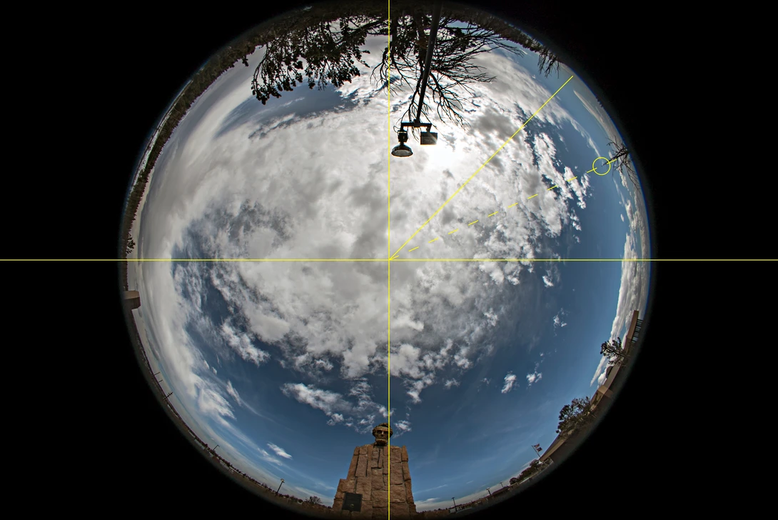 But why? What use does the following process have? This process can be used to help measure object movement through space. For instance, a comet could be tracked for many nights to calculate trajectory, speed, and direction. Satellites could be recorded over a span of minutes for the same purpose. Tree canopies could be recorded from the same location to measure growth over months or years. The orbits of planets could be plotted against the zenith to study their rotation around the sun. Cloud size could be measured for estimating the water volume they contain. Knowing the geometry behind this lens' scientific use opens a number of doors for interesting and creative projects. Let's imagine that we've discovered a meteor heading toward Earth and we want to track its progress.