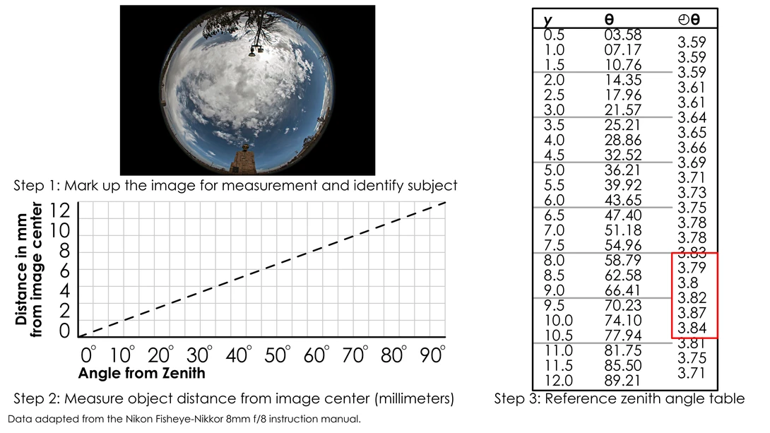 And there we have it, all that math you told your high school teacher you'd never need used here in practical application! One key point, this will not work with all circular fisheye lenses equally. This Nikon lens is, as the angular distances in the table above demonstrate, highly corrected and the light rays bending through it are kept in relatively uniform configuration. In video samples with this lens, objects grow larger as they approach the lens center, definitely, but they do so at a uniform rate. In many circular fisheye lenses, such as the inexpensive ones being produced for aperture-priority shooting right now, the magnification across the image plane changes dramatically, especially toward the image's center. This leads to objects growing in magnification drastically as they move in the image field and that means those lenses are not corrected suitably for scientific use. So this technique may be achievable with other lenses, but the numbers and tables needed for calculations will be drastically different.