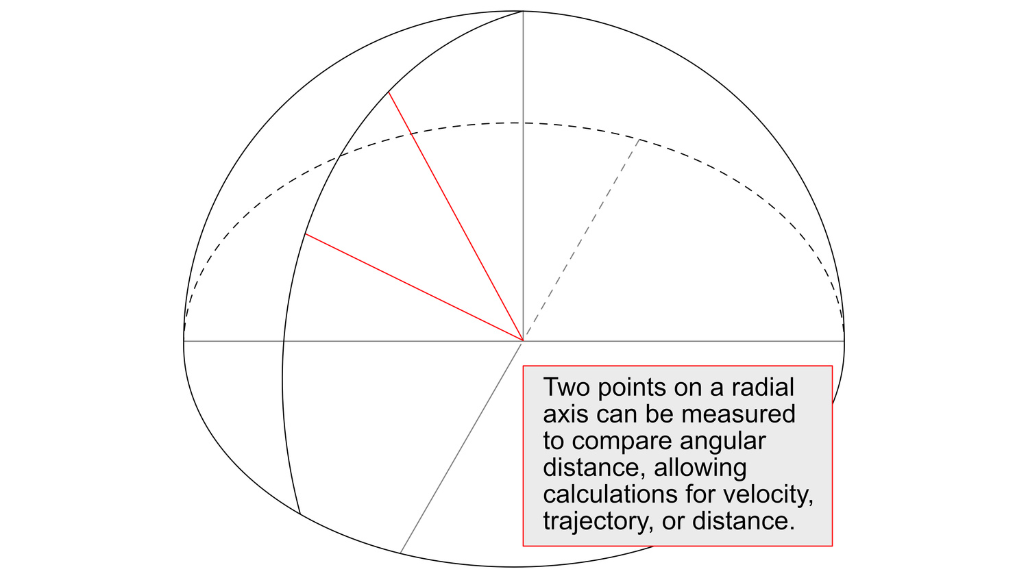 For this example, we need two subjects on the same radial path, which is to say that they need to have a common trajectory toward the center. (A subject that's moving tangentially to the center can have its path and velocity calculated but it requires some significant math that understands the spatial geometry of cones. I am not the photographer to tell you about that.) Measuring the two points we identified indicates that they are roughly 2.5mm apart. The table in the instruction manual has a third column and that allows us to calculate the angular distance. The third column is offset by a half-line so that we can calculate to quarter-millimeter accuracy. Doing so from zero lets us know that the difference is 3.59+3.59+3.59+3.61+(3.61 / 2) = 16.185 degrees.