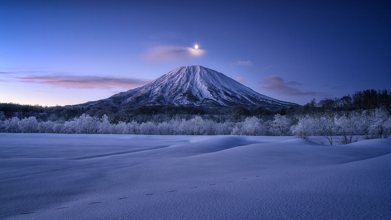 Early in the morning, as the sun was rising, the moon was shining directly above Ezo Fuji, and the cold weather had covered the trees in frost, creating a beautiful sight.
