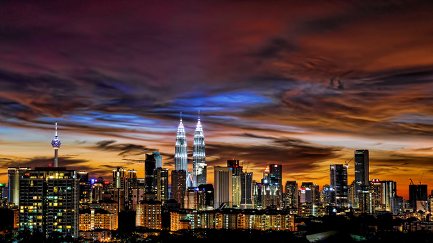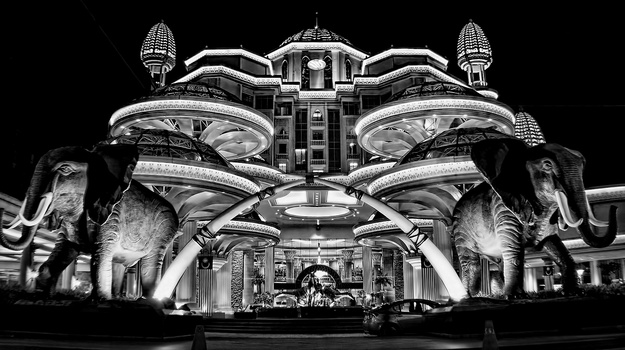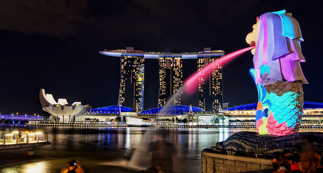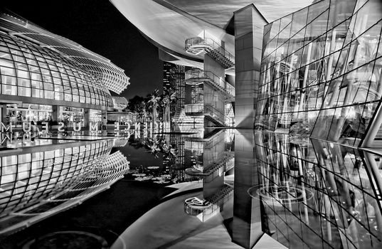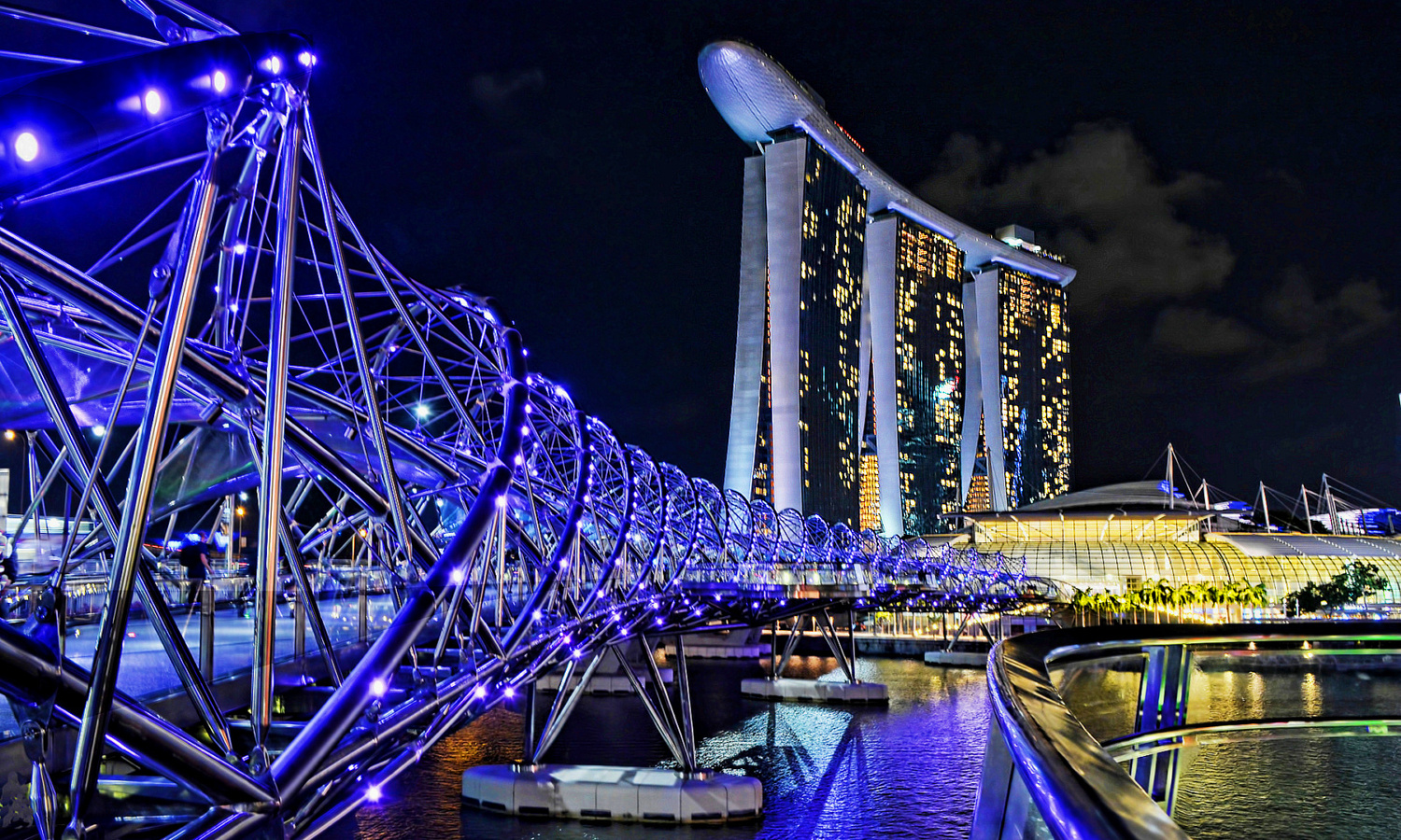 a night perspective of the double helix bridge leading to the Marina Bay Sands Hotel in Singapore