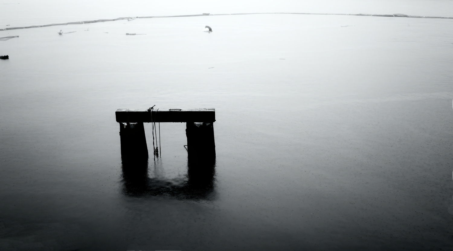 Old dock pilings in the sea. Monochrome, minimalist shot