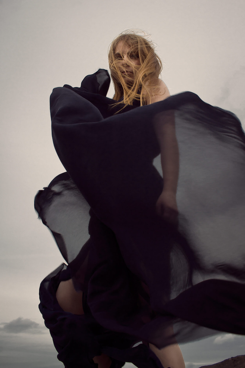 Shot in natural light with a 24mm lense. Despite being super cold and messing up the hair, the wind did us a huge favour by moving the fabrics and dresses we brought beautifully.