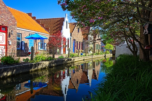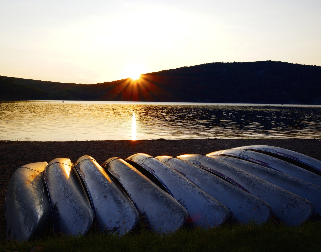 Rental canoes at a local beach retired for the day. Low sun provides wam horizontal lighting.