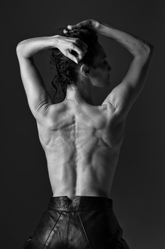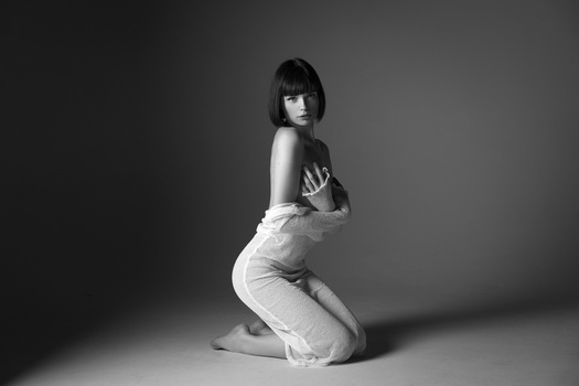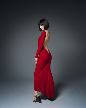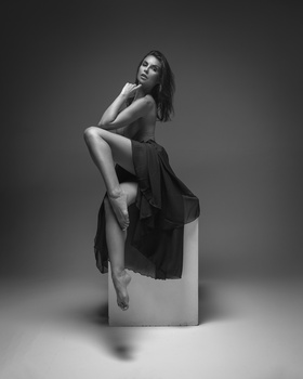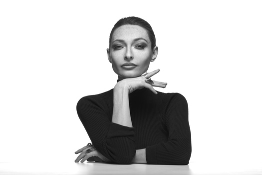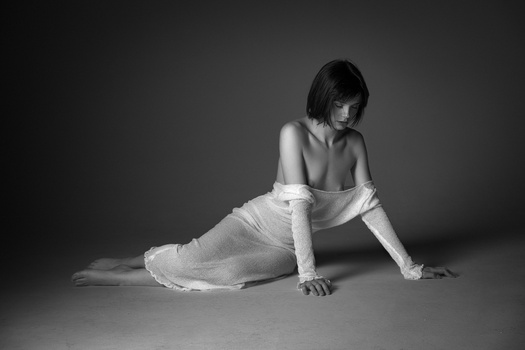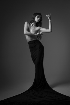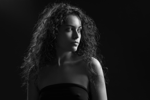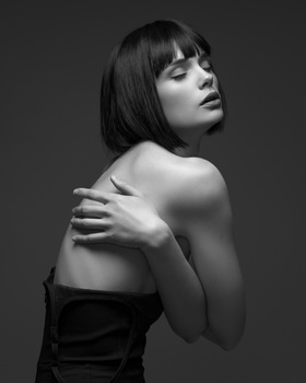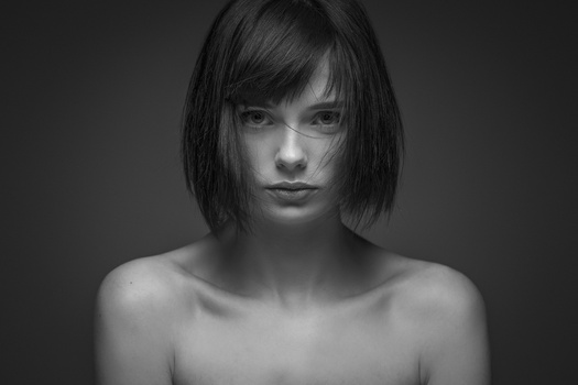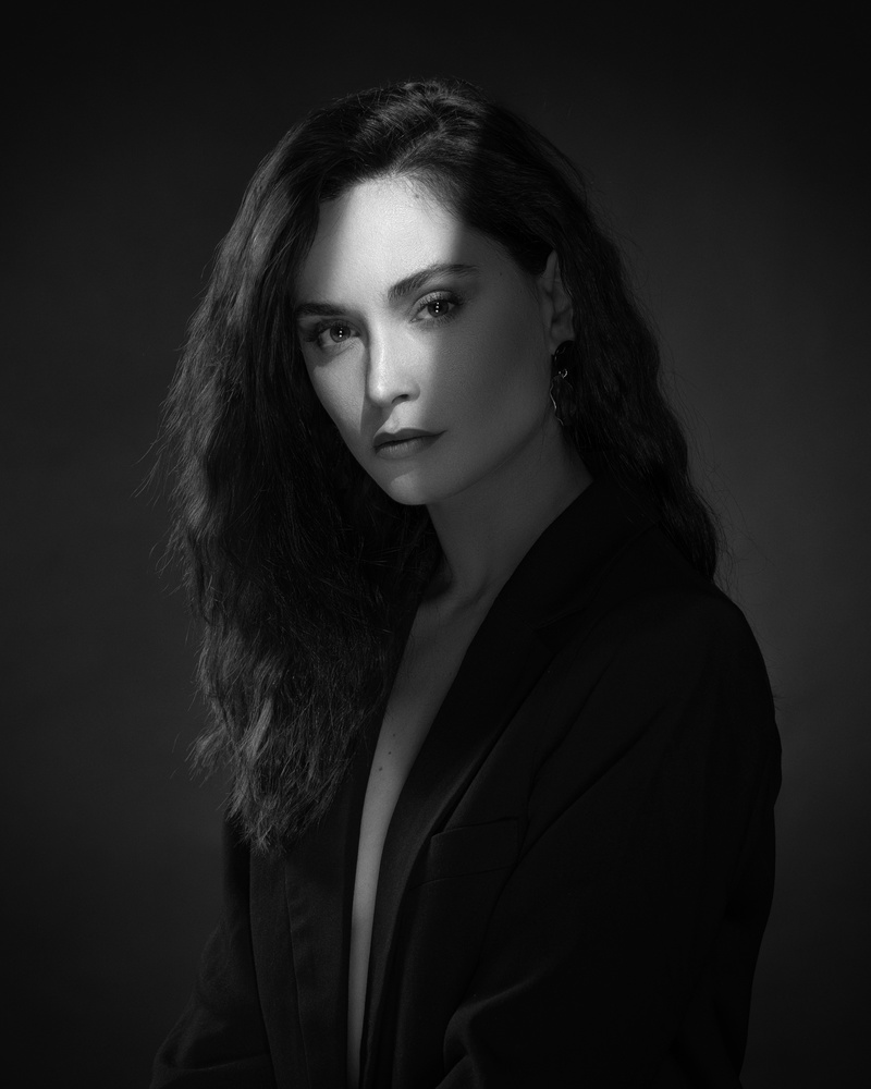 Timeless portrait in studio, 4 strobes were used, key light is an optical snoot, fill light is an 165cm umbrella, hair light is a beauty dish with grid, the background is lit with a barebulb and cinefoil in snoot shape.