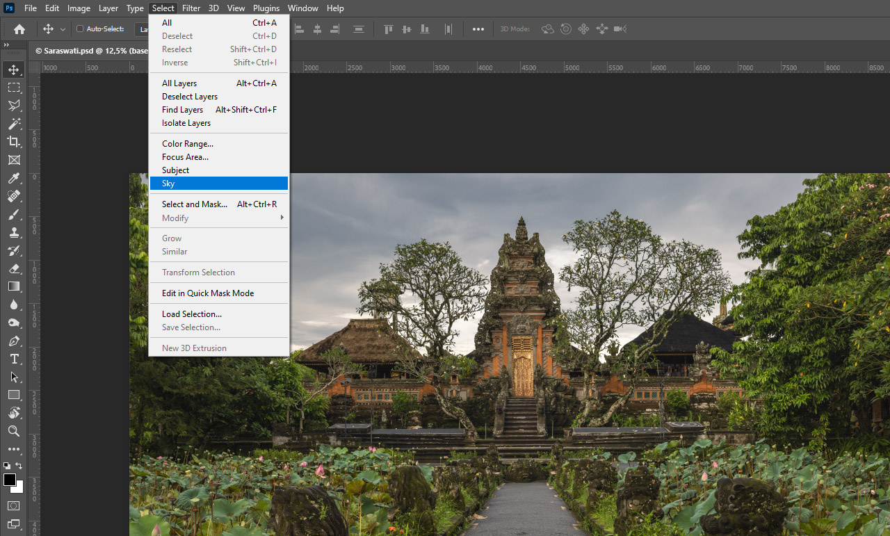 To create a sky selection in Photoshop, head to "Select - Sky." Photoshop will analyze the image to find areas it thinks to belong to the sky. Once finished, you'll see the marching ants highlighting the selection.