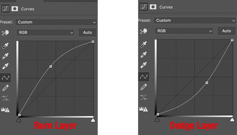 One advantage of this method is that later you can adjust the curve up or down to strengthen or weaken the effect across the entire image if needed. On your first tries, you will probably need it. By having separate dodge and burn layers, you can also adjust each effect individually, and you can do it at any point in your editing, even late in the game.