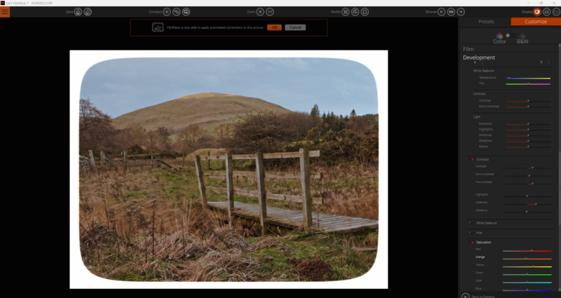 On clicking an image, it opens into the presets section. A banner is then displayed at the top of the image indicating that the automatic lens correction is being downloaded. When that download completes, the banner tells you that FilmPack is ready to apply the automated optical and noise corrections to the photo; FilmPack uses the same uniquely accurate DxO Optics Modules as DxO PhotoLab. Clicking OK validates that.