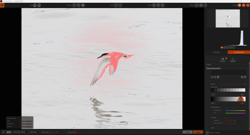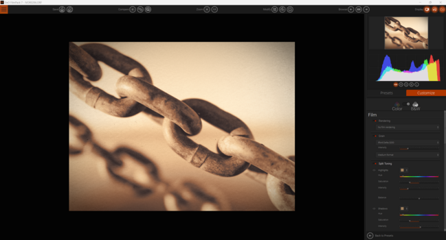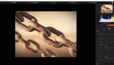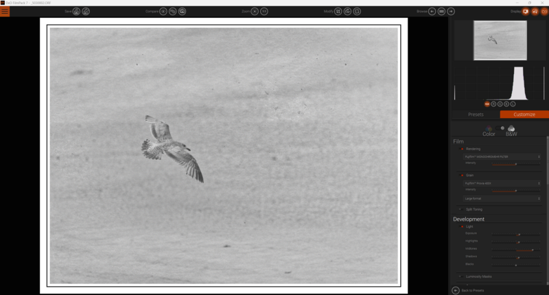 The Film palette allows you to emulate different films, add grain, and apply split toning. Below that is the Development palette. That has the usual color and tonal adjustments you find in most raw development programs and luminosity masking.