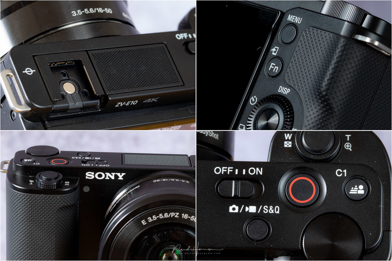 When looking carefully at the Sony ZV-E10, I see a small camera with a nice LCD screen that is fully articulating, perfect for filming yourself. When you press the record button, a thick red rectangle appears around the screen. The mode button allows you to change the exposure settings from fully automated to one of the other three: manual, aperture priority, and shutter priority. Switching from one setting to another brings out a nice photo in the background of the LCD screen, showing the effect you can reach with that setting.