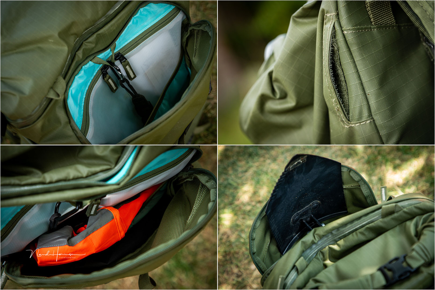 A large front compartment extends all the way down, providing enough space for a compact avalanche shovel. There are also two smaller pockets located inside this front compartment, and a water bladder can be stored in a separate sleeve. Additionally, the expandable roll-top features two large mesh pockets.