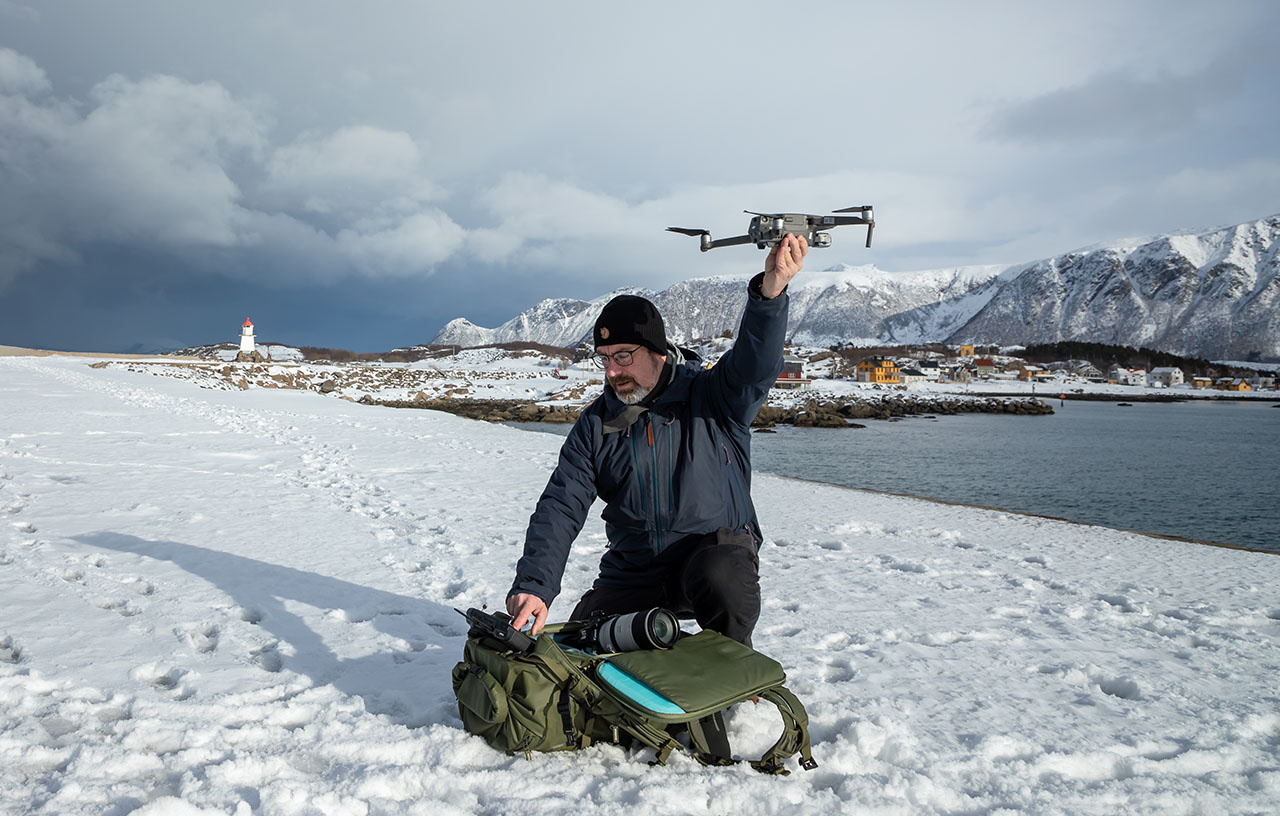 In most situations, I use the large DSLR core unit to carry my gear. Inside, I store a Canon mirrorless camera, a large telephoto zoom lens, and two smaller zoom lenses. Additionally, I carry a DJI Mavic Pro 2 drone with two spare batteries and a smart controller. There's also room for an additional lens or a second camera if necessary. The Action X50 includes a laptop sleeve in the back access panel, suitable for a 15-inch laptop.