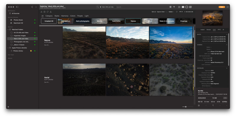 It takes some time to get used to the layout of the app and the icons, but it's not too tough and becomes second nature. You can look at everything at once, or narrow a search. I do a lot of drone photography and have my images in folders based on the aircraft I used for them. Beyond that are folders named by location and date.