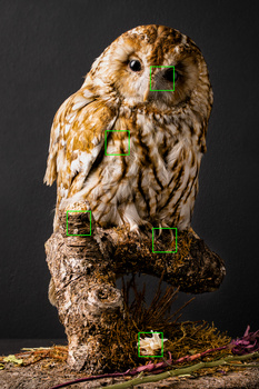 These images are some of the initial shots I took when I first got the lens. The first shows 100% magnification at the focus point, which was the top of the "o" and shows how narrow the depth of field is. The second image of the owl is a five-point stacked image to see what the results would be with only five focus points. The other two images were focus practice with the second series set being 11cm away from the front element.