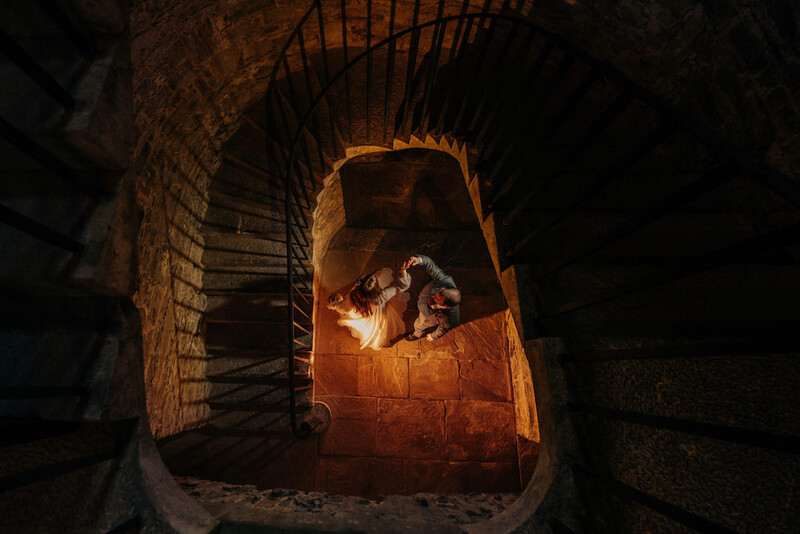 Stairs and staircases can also create leading lines. With the subjects on the ground floor, photographers can climb up a spiral staircase and shoot down. The staircase then creates leading lines that spiral right into the subject. See the examples below.