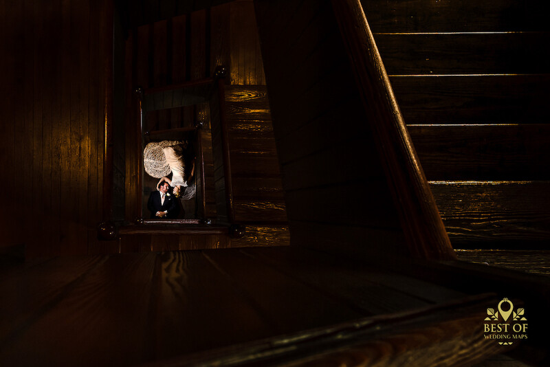 With straight stairs, photographers can also place the subject at the top and the stairs will create a leading line right into the couple, as you see in the image below.